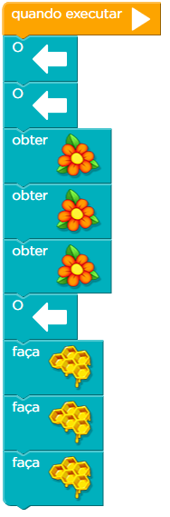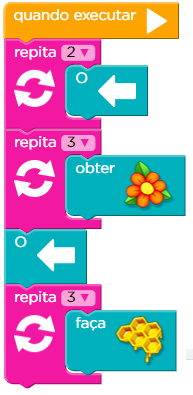 Vamos acessar uma nova fase do jogo Abelha. Clique aqui. Neste novo nível do jogo Abelha, vamos continuar coletando Néctar das flores e levando para as colmeias para fazer mel. Porém, ao invés de usarmos vários blocos de “Obter Néctar” e “Faça Mel”, usaremos blocos de Laços com os blocos “Obter Néctar” e “Faça Mel” dentro para serem repetidos o número de vezes apontado pelo bloco de Laço. Veja abaixo que ambos os códigos estão fazendo a mesma coisa.