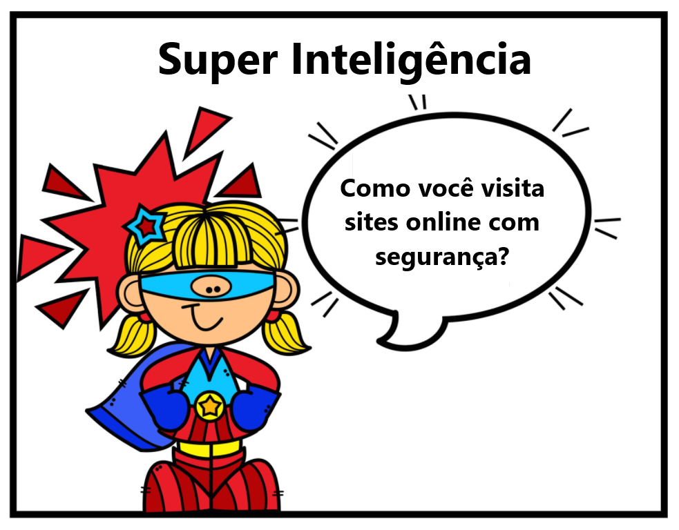 “A Super Inteligência gosta muito de usar o computador da mãe dela, mas antes de mexer ela sempre pede permissão. Ela ama o computador, porque pode navegar na internet e lá é quase como se fosse o bairro onde mora, ela visita lugares legais, fala com sua família e amigos e faz muitas coisas que gosta. Ontem mesmo, ela visitou um zoológico online e viu um bebê zebra muito fofo. Ela tirou foto do bebê e editou para mudar suas cores e colocou um chapéu nele, muito legal né? Depois, ela visitou o Quênia lá na África e viu muuuitas zebras por lá. Na internet, a Super Inteligência só fala com pessoas que ela conhece, como a sua avó que vive em outro estado. O que ela mais gosta de fazer é jogar joguinhos divertidos, mas ela também gosta de criar coisas novas e compartilhar com seus amigos. Ás vezes, ela gosta de visitar sites diferentes, como um museu online, mas nossa super-heroína só fica em sites apropriados para a idade dela. A internet é um lugar muito divertido, mas assim como atravessar a rua do nosso bairro, é preciso ter cuidado.”