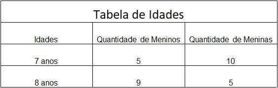 Antes de iniciar a aula faça uma pesquisa para verificar a idade e o gênero dos alunos. Conte quantos meninos tem na turma com tal idade e quantas meninas tem na turma com tal idade. Por exemplo: Em minha turma há 5 meninos com 7 anos e 9 meninos com 8 anos, 10 meninas com 7 anos e 5 meninas com 8 anos. O objetivo é você coletar dados para apresentar uma tabela e um gráfico.