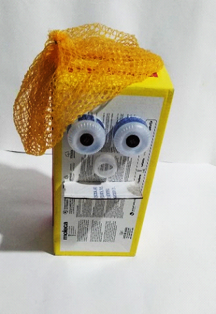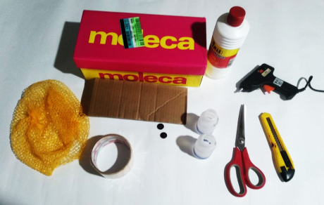 Saco de laranja – Fita Adesiva Transparente – Caixa de papelão – Pedaço de papelão – cola – Pistola e Bastão de cola quente – Tesoura – Estilete – 2 Botões – 2 Potes de “Yakult”