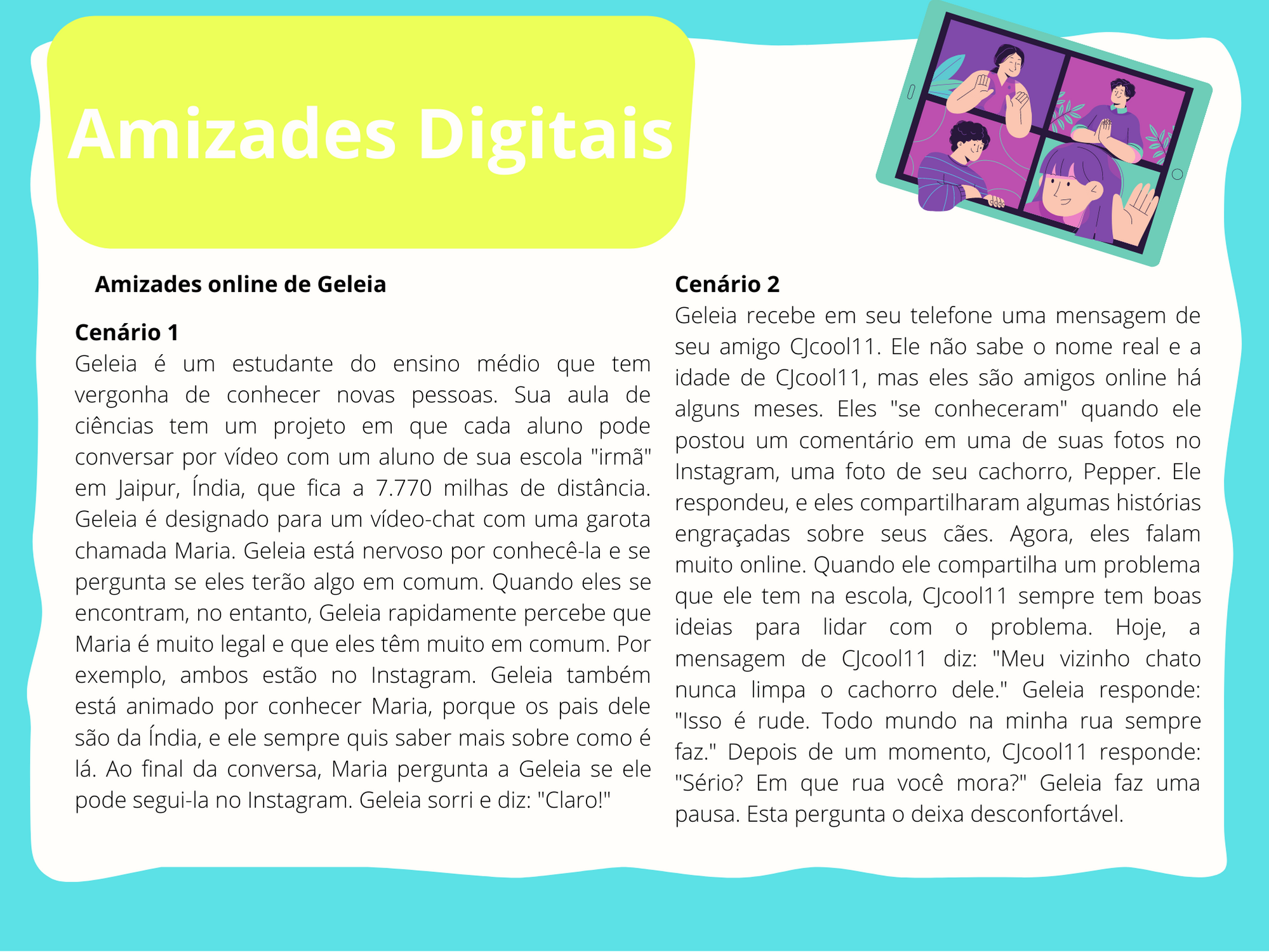As crianças fazem amigos onde quer que vão – inclusive online. Mas todas essas amizades são iguais? Como as crianças podem iniciar amizades online e também aprender maneiras de se manter seguras? Nesse capitulo você ensinou aos seus alunos a entenderem os benefícios e os riscos de amizades apenas online.