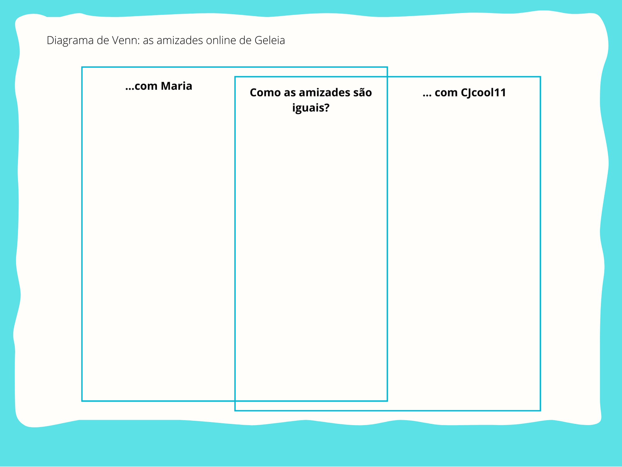 Convide os alunos a compartilhar. Peça-lhes que apoiem suas respostas com detalhes da história. Conforme os alunos fornecem respostas, adicione-as ao local apropriado no diagrama de Venn. Se os alunos fizerem afirmações sobre o sexo ou a idade de CJcool11, certifique-se de esclarecer que Geleia nunca viu ou conheceu CJcool11 pessoalmente e não sabe realmente esses detalhes sobre ele.