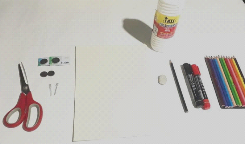 Tesoura – 2 led 3V– 2 ímãs – 2 baterias 3V – 1 Folha de papel cartão – Cola – Lápis – Borracha – Canetinhas – Lápis de cor