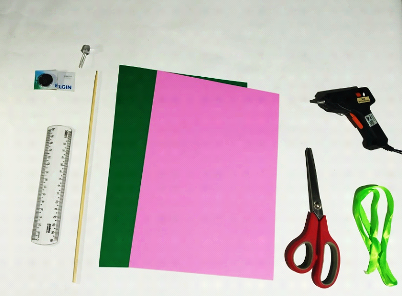 Régua – 1 Bateria 3V – 1 led 3V – 2 Folhas de A4 coloridas – Pistola e Bastão de cola quente – Tesoura – Fita ou Fitilho