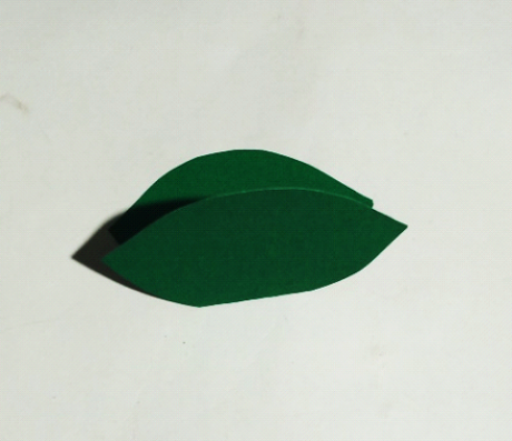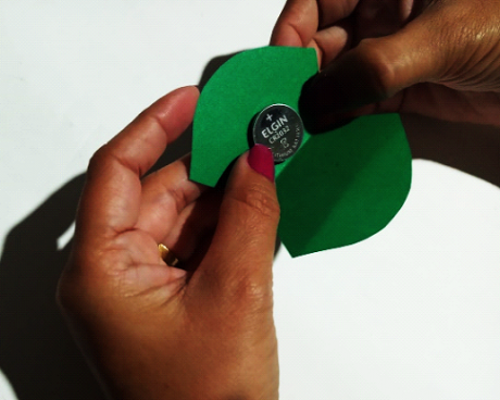 Vamos para a folha, Pegue um pedaço de papel verde dobre ao meio e molde a folha. Depois coloque a bateria dentro. Cole, mas deixe uma abertura em cima, pois servirá para encaixar as perninhas da led.