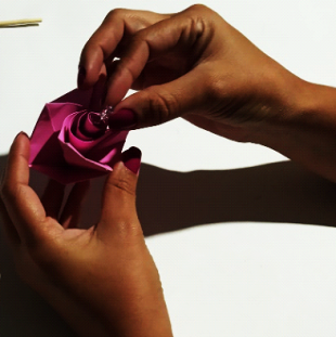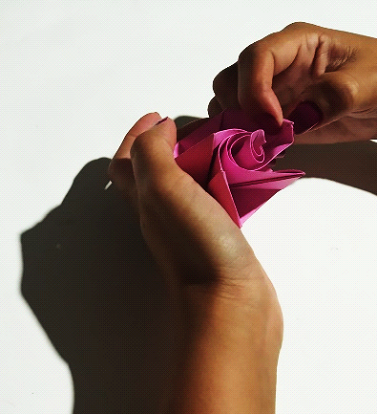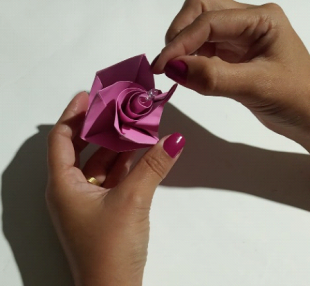 Coloque a ponta que sobrou para cima e segure a parte de baixo com a mão. Comece a girar essa ponta para montar a flor.