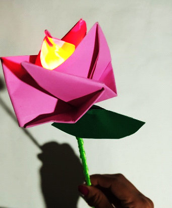 Pegue o fitilho e envolva o palito para o cobrir, após isso cole as partes da flor. Encaixe as pernas da led na bateria e então você terá uma linda flor que acende.