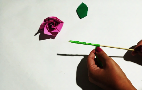 Coloque a led na flor. Você vai precisar furar o papel para que a perna da led ultrapasse a base da flor para alcançar a folha.