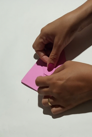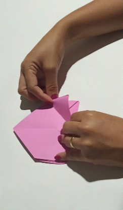 Pegue a ponta e vá até a metade do “triângulo, faça isso com a outra ponta também. O bico que sobrar deve ser dobrado para cima até chegar ao meio do triângulo. Vire a folha e repita esse processo do outro lado.