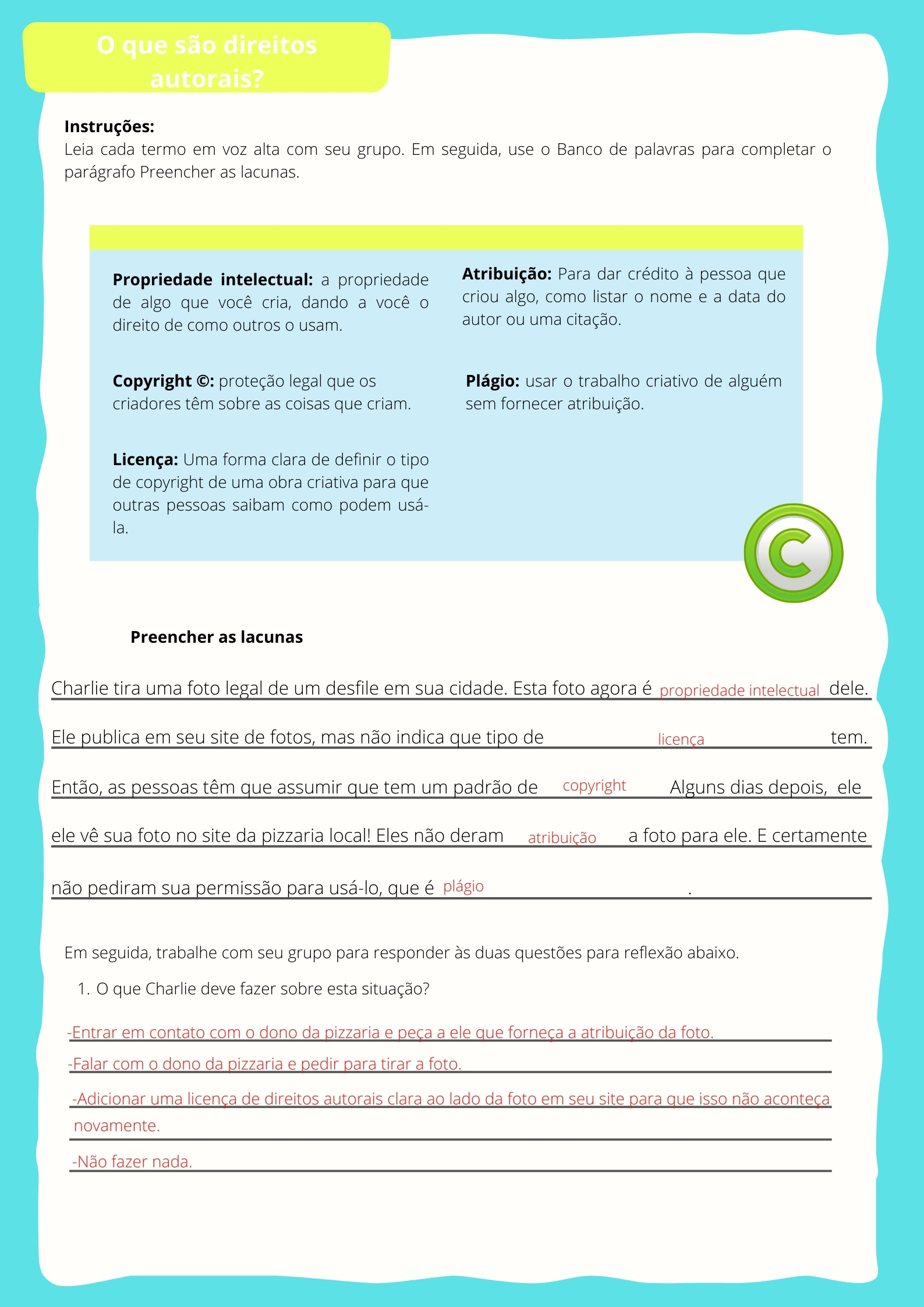 Orientações: Inicie a aula perguntando: vocês já ouviram falar do termo “direitos autorais”? O que vem à mente quando vocês escutam essa palavra?