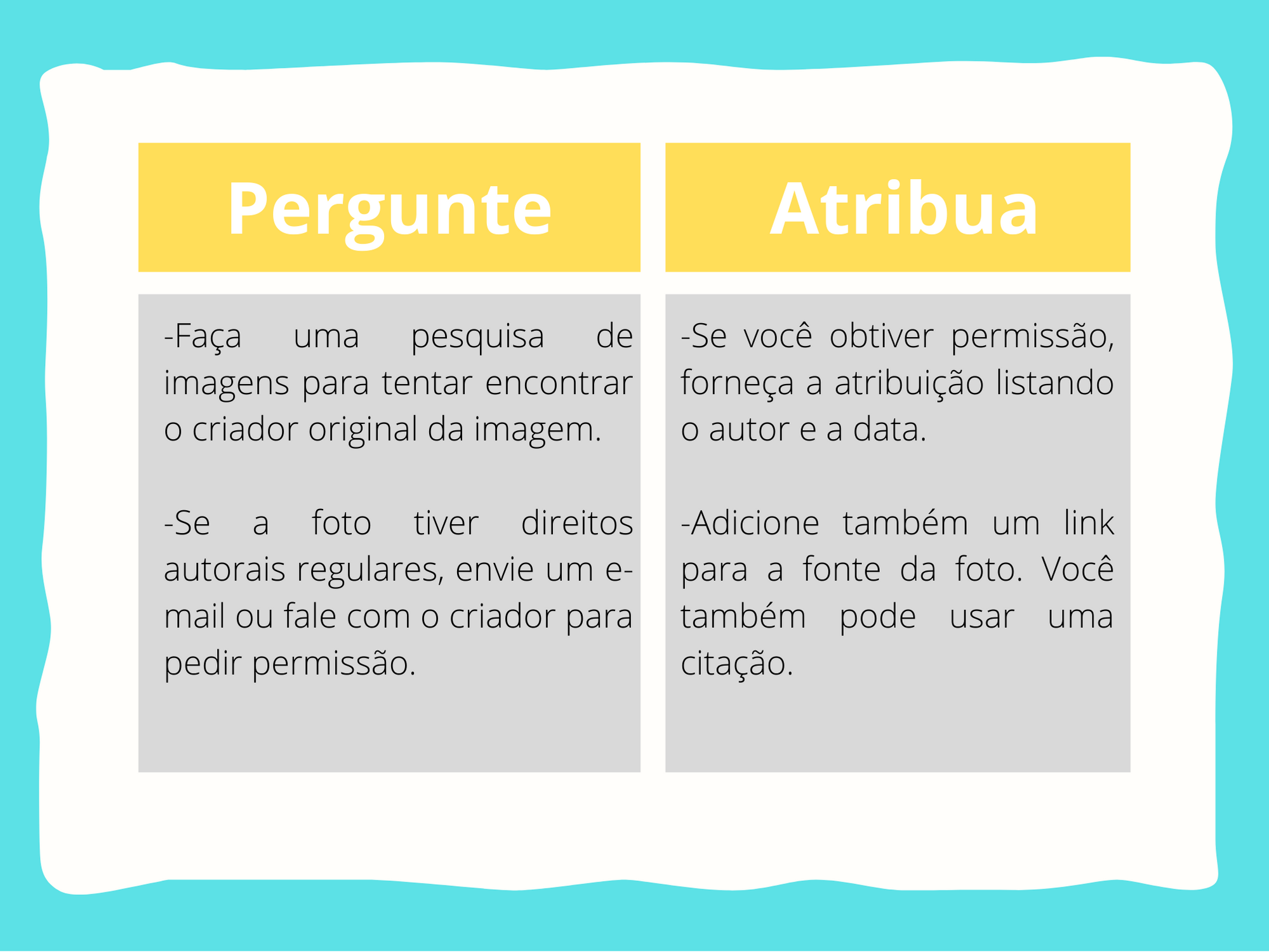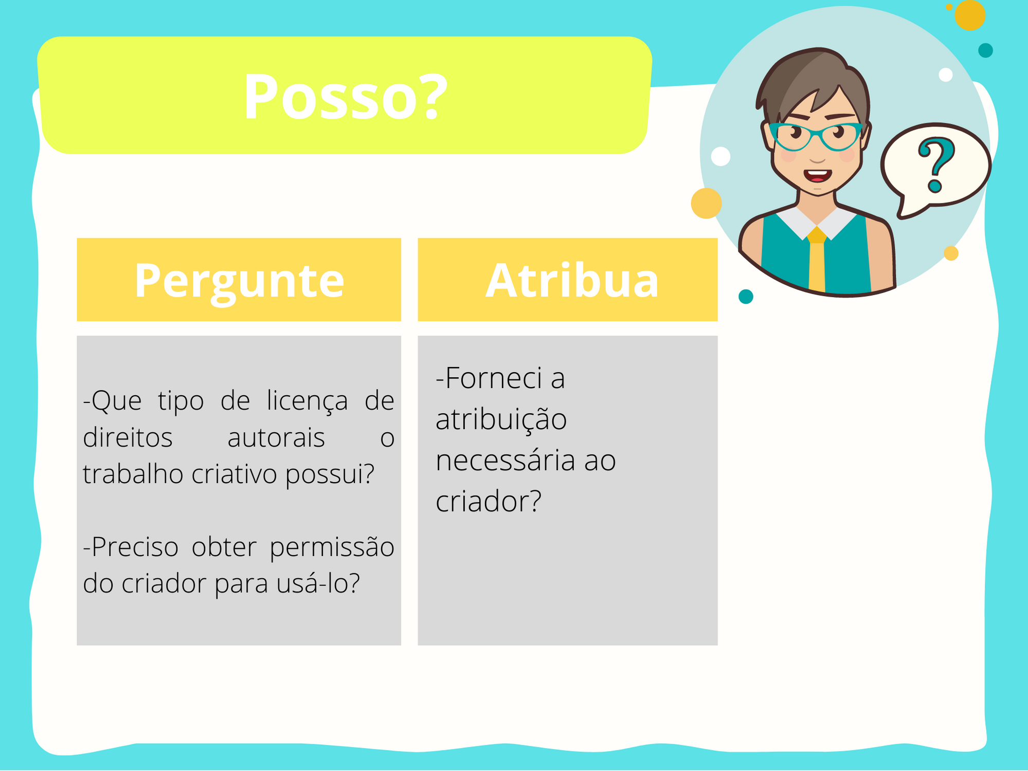 Peça para os alunos abrirem a página 19 da apostila, ou entregue o material, imprima aqui: tabela, e explique que “Perguntar e atribuir” significa que antes de usar uma foto online, você deve: