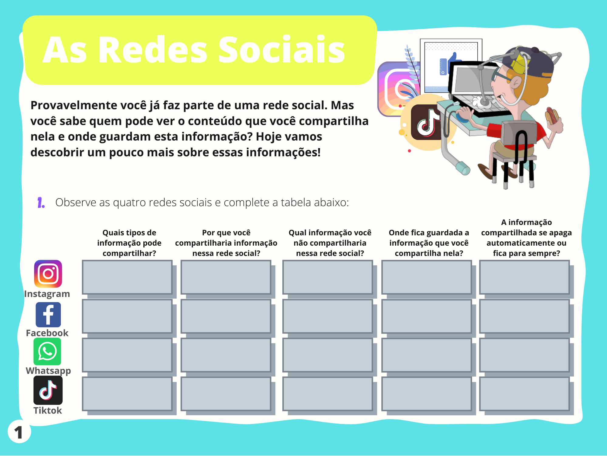 Orientações: Inicia a aula pedindo para os alunos abrirem na página 13 da apostila, ou imprima o material aqui: Tabela. Ajude os alunos a pensar sobre como cada parte da tabela pode tornar uma escolha de mídia mais (ou menos) saudável.