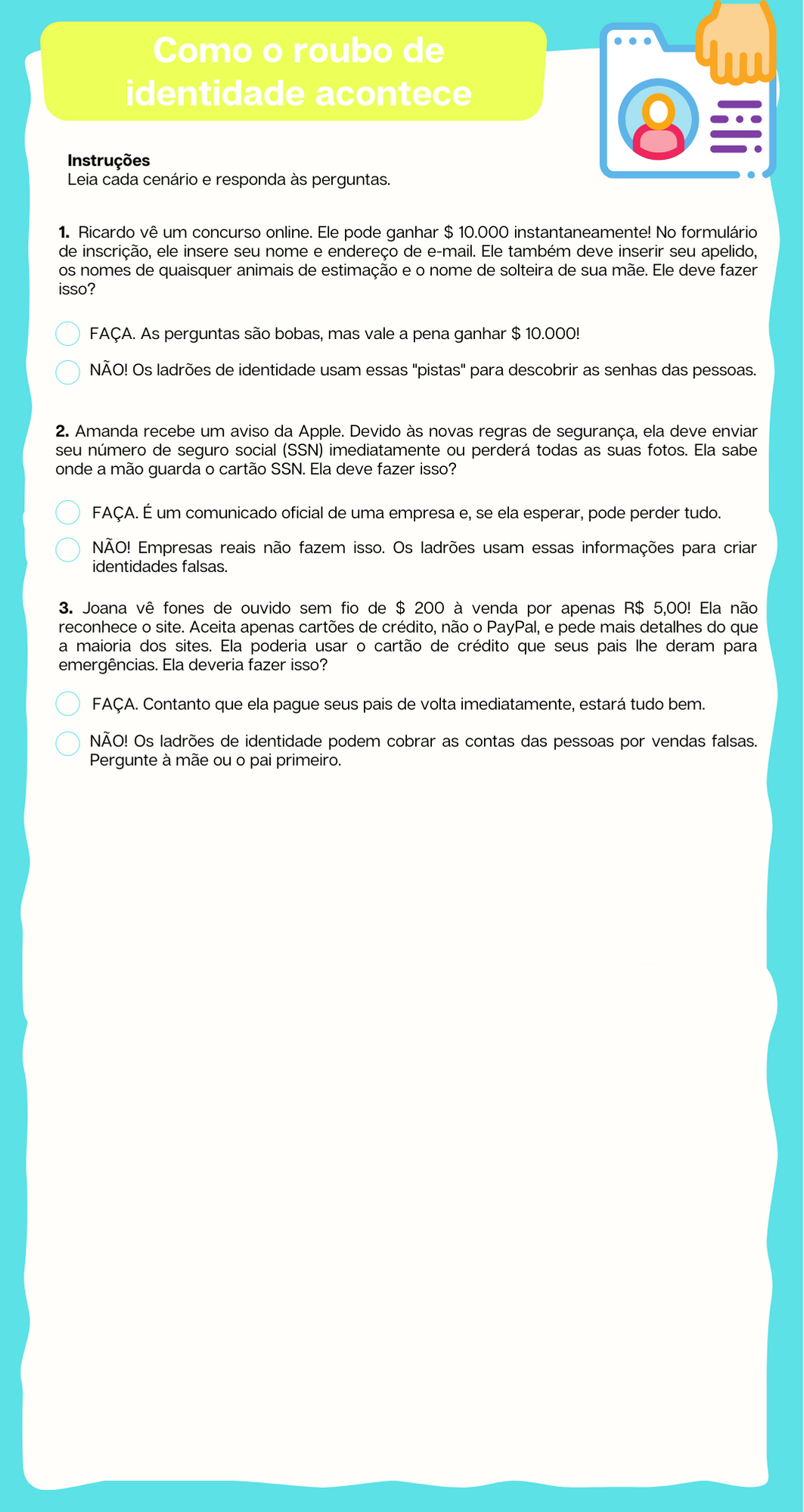 Peça para os alunos formarem duplas ou abrirem na página 8 do material, ou imprima aqui: Folheto. Dê aos alunos dois minutos para concluir a atividade. A maioria dos alunos reconhecerá rapidamente que “NÃO!” é a resposta certa a cada vez. Desafie-os a descobrir os motivos pelos quais cada personagem em cada cenário pode ter sido enganado pelos golpes. Os alunos podem indicar os seguintes motivos: