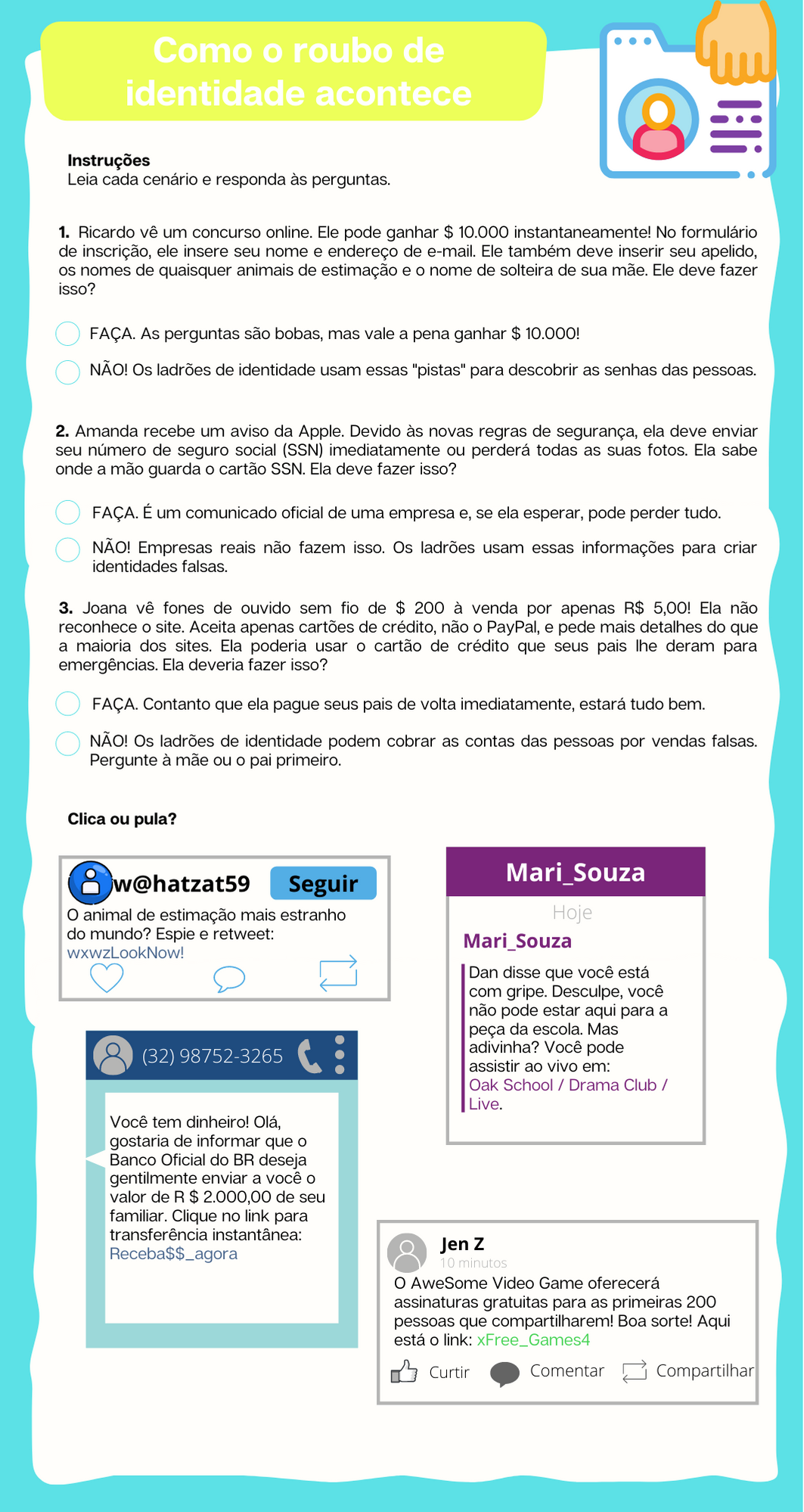 Os golpes da Internet fazem parte do processo de estar online hoje, mas muitas crianças podem não estar cientes deles. Nesse capítulo ajudamos nossos alunos a evitar que cliquem em links maliciosos ou forneçam informações privadas. Utilizamos esta lição para ajudar as crianças a evitar o roubo de identidade online e esquemas de phishing.