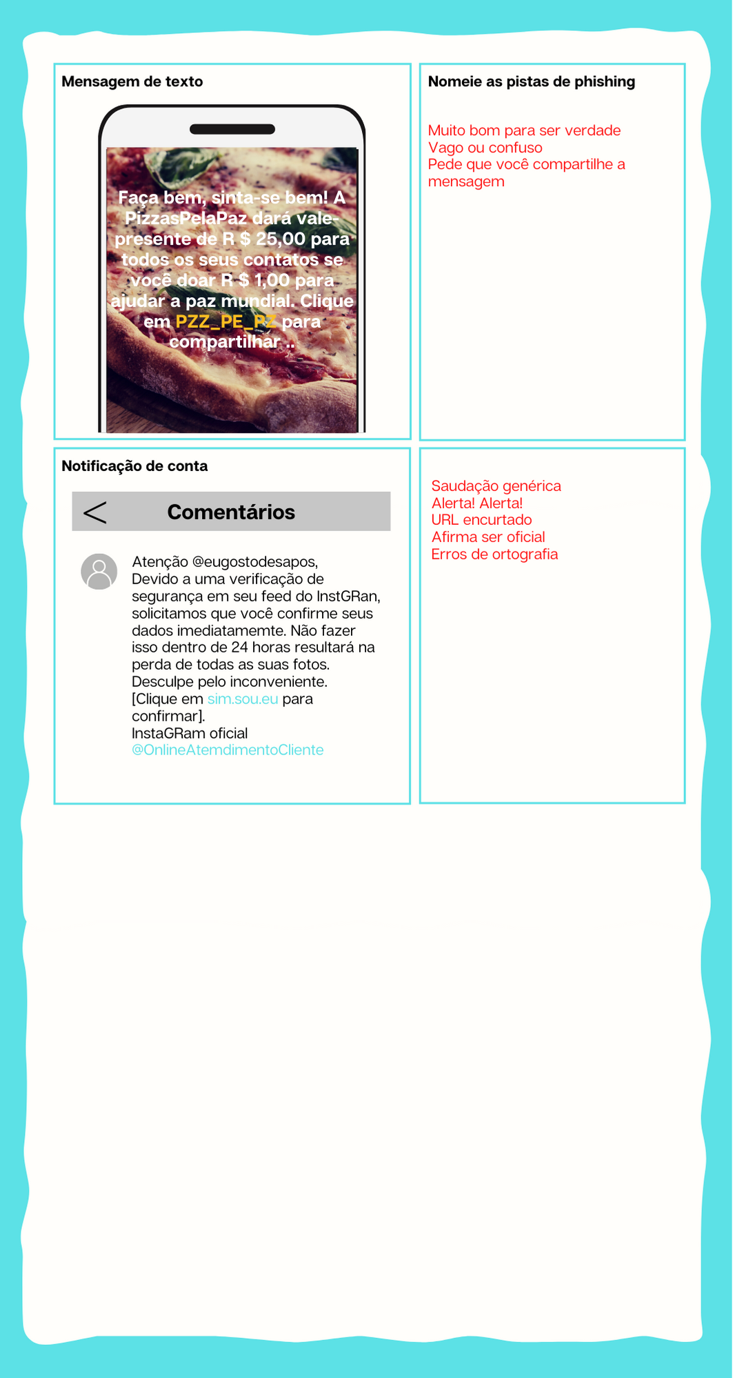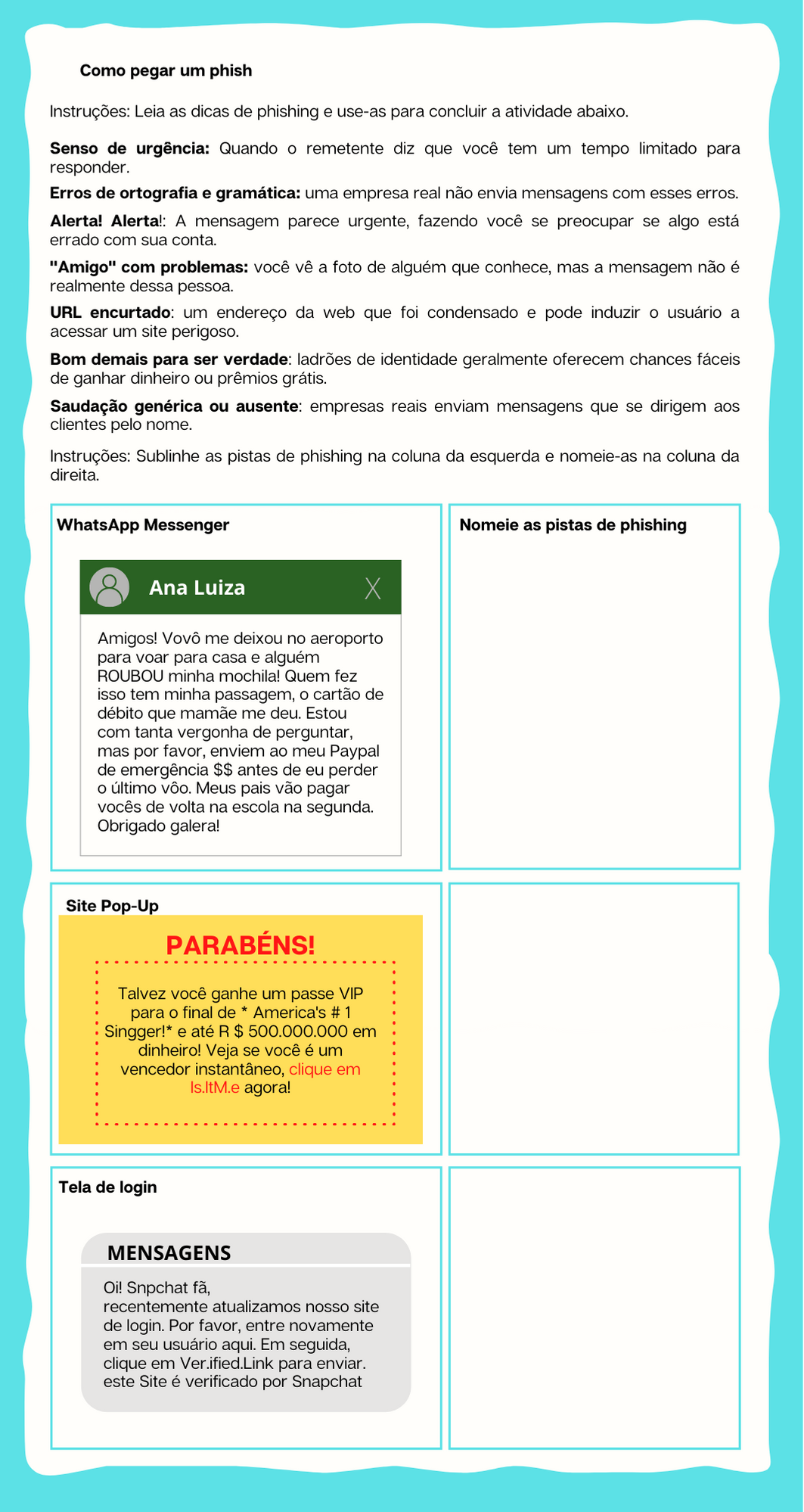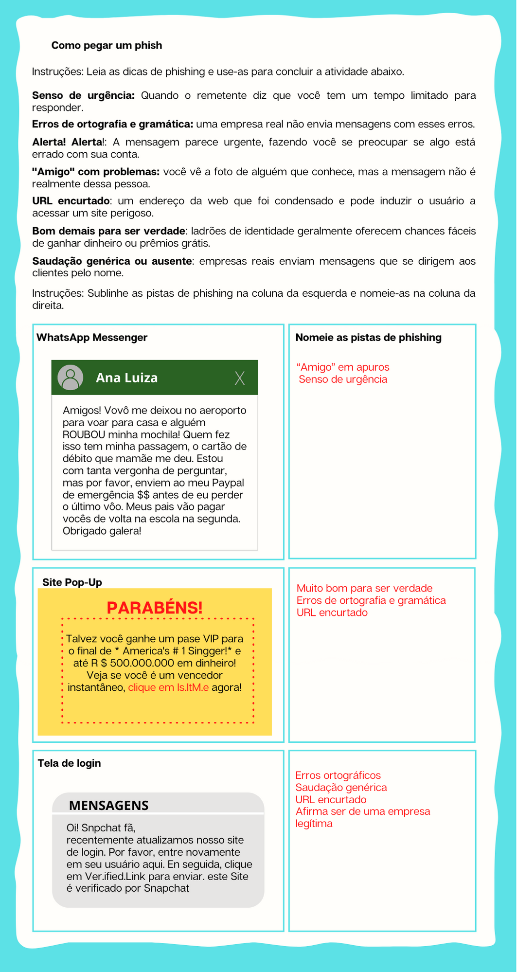 - Usar dicas de mensagens para identificar exemplos de phishing.