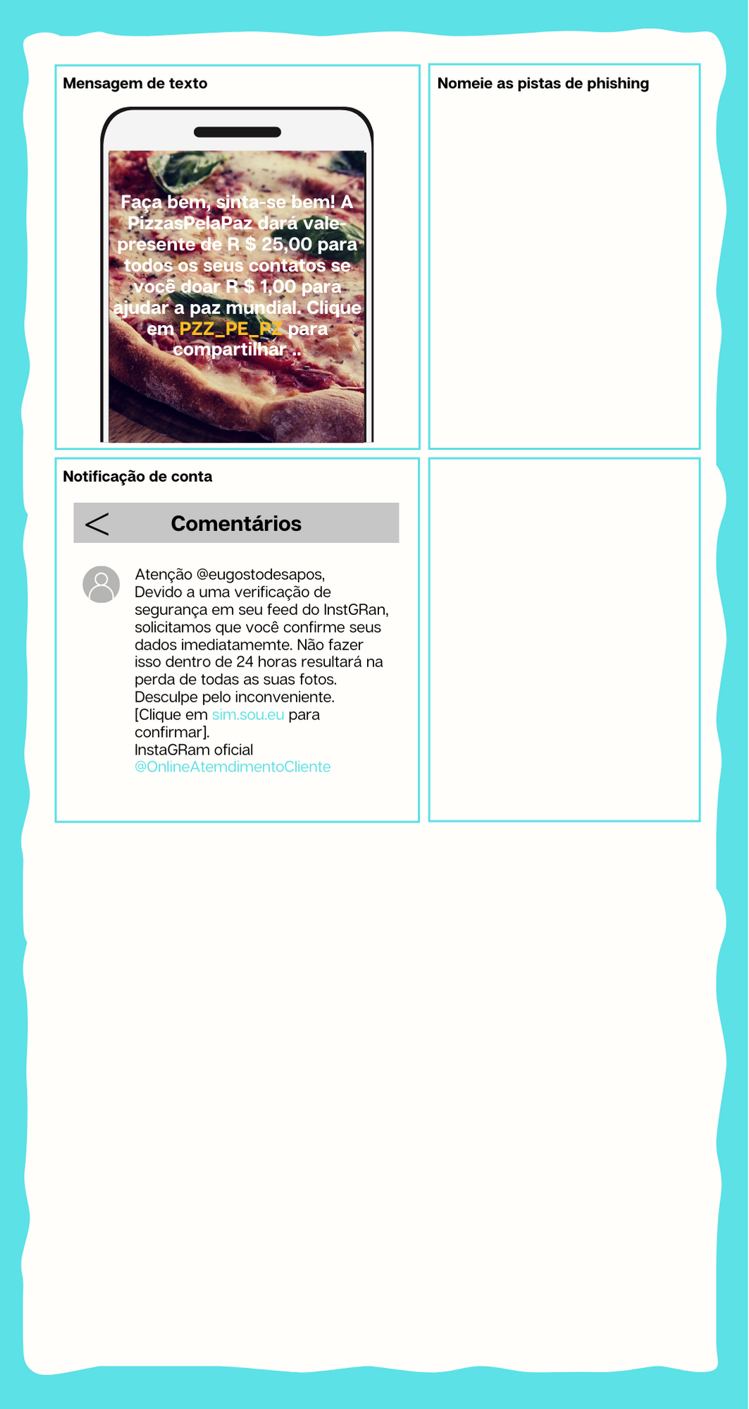 Diga aos alunos que eles trabalharão em pares para analisar exemplos de mensagens que usam truques para obter suas informações. Peça para discutirem as pistas para as mensagens que podem ser golpes de phishing, destacarem as pistas nas mensagens e adicionarem uma observação sobre as pistas na caixa da direita.