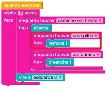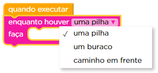 Usaremos um bloco novo, mas que funciona muito parecido com o que vimos anteriormente. O bloco “Enquanto” fará com que ações sejam executadas enquanto alguma condição estiver sendo atendida. Dentre essas condições podem estar: existir uma pilha de terra, existir um buraco, existir um caminho livre em frente. Mude este bloco clicando na setinha para escolher o Laço e a Condição necessárias para resolver seus problemas.