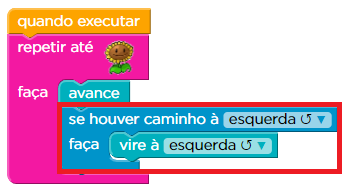 Então, usamos o bloco “Avance” dentro do “Repita” para que ele continue avançando, já que ele quer apenas seguir em frente. Então, quando há uma curva para a esquerda, o bloco “Se” diz para ele virar à esquerda. Você pode ver que, se continuarmos fazendo isso, virando à esquerda quando possível e avançando, vamos atingir nosso objetivo.