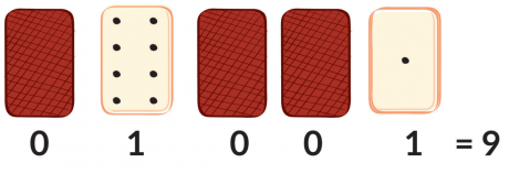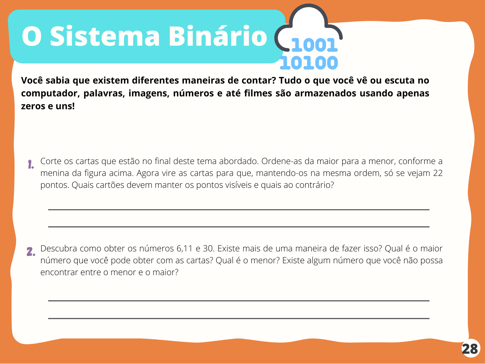 Salientamos aos alunos que por baixo de cada carta virada para cima existe um 1 e por baixo de cada carta virada para baixo, um 0. Utilizamos estes valores para indicar os dois estados possíveis em que uma carta pode estar: virada para cima e virada para baixo. Mesmo se apagarmos os cartões, a informação sobre se cada um estava voltado para cima ou para baixo é codificada na sequência de bits.