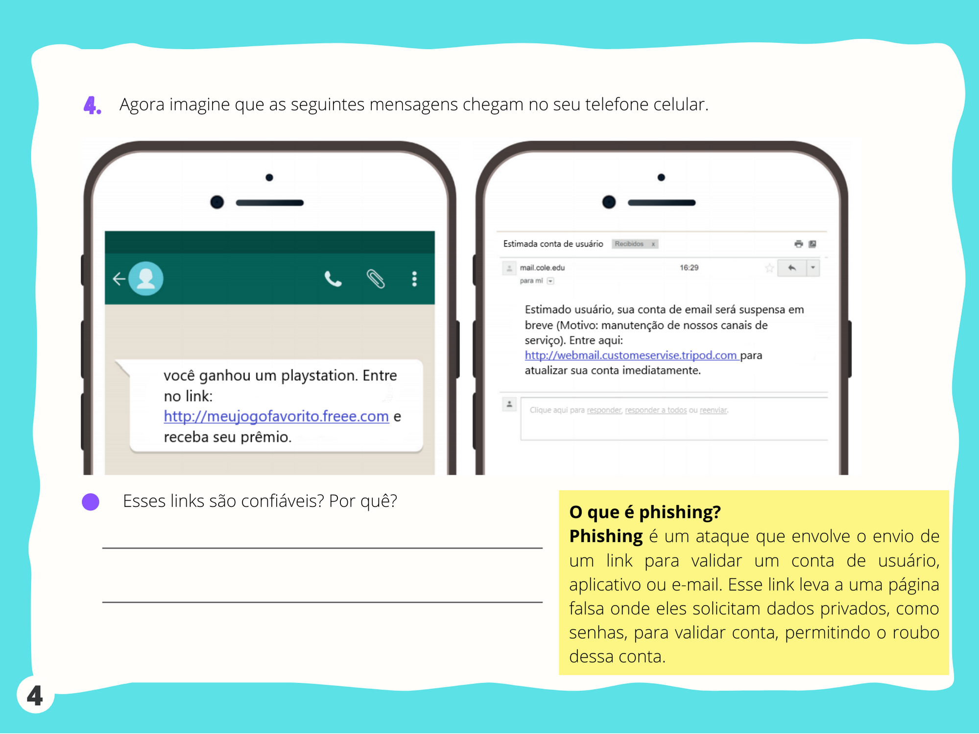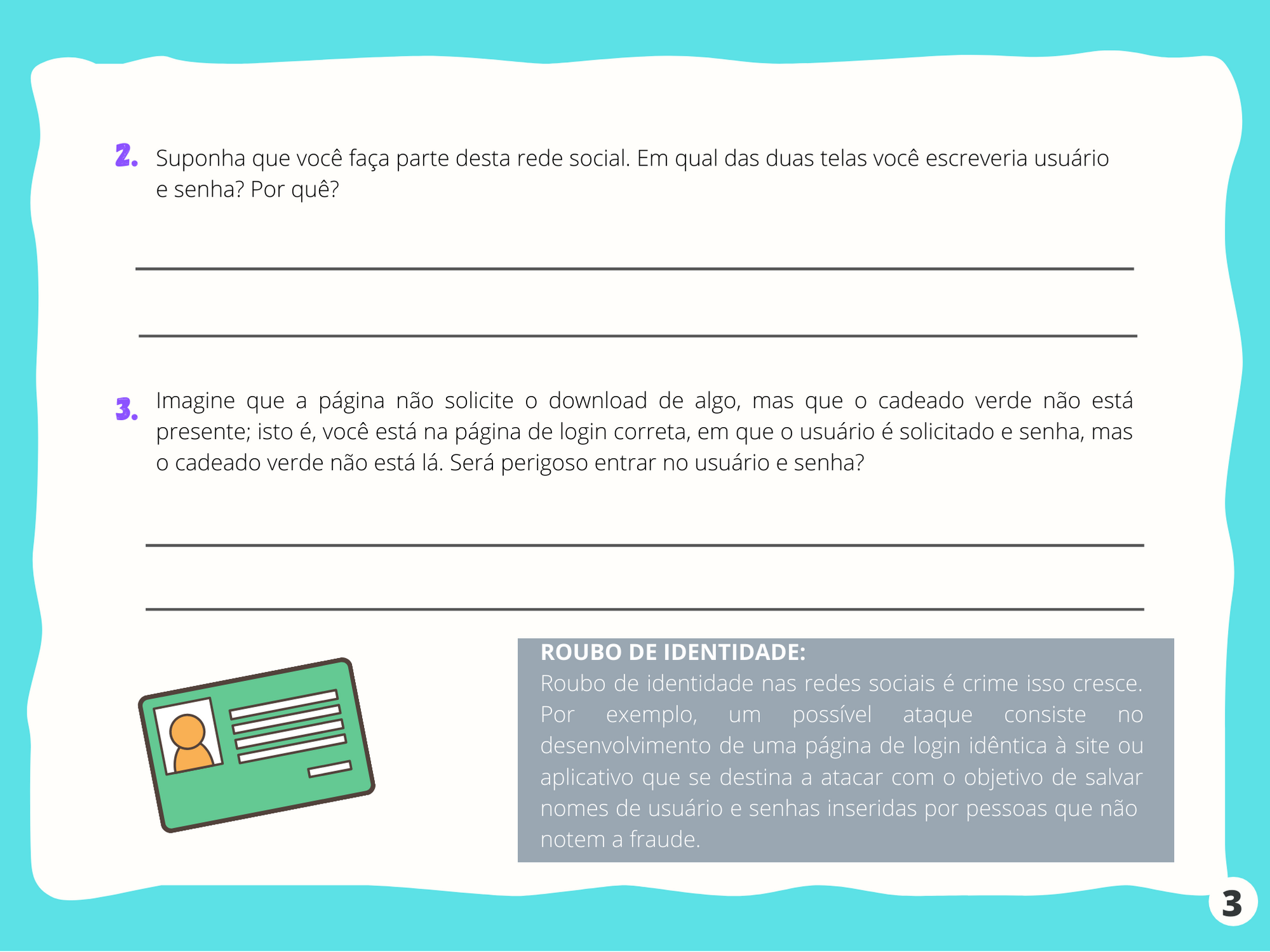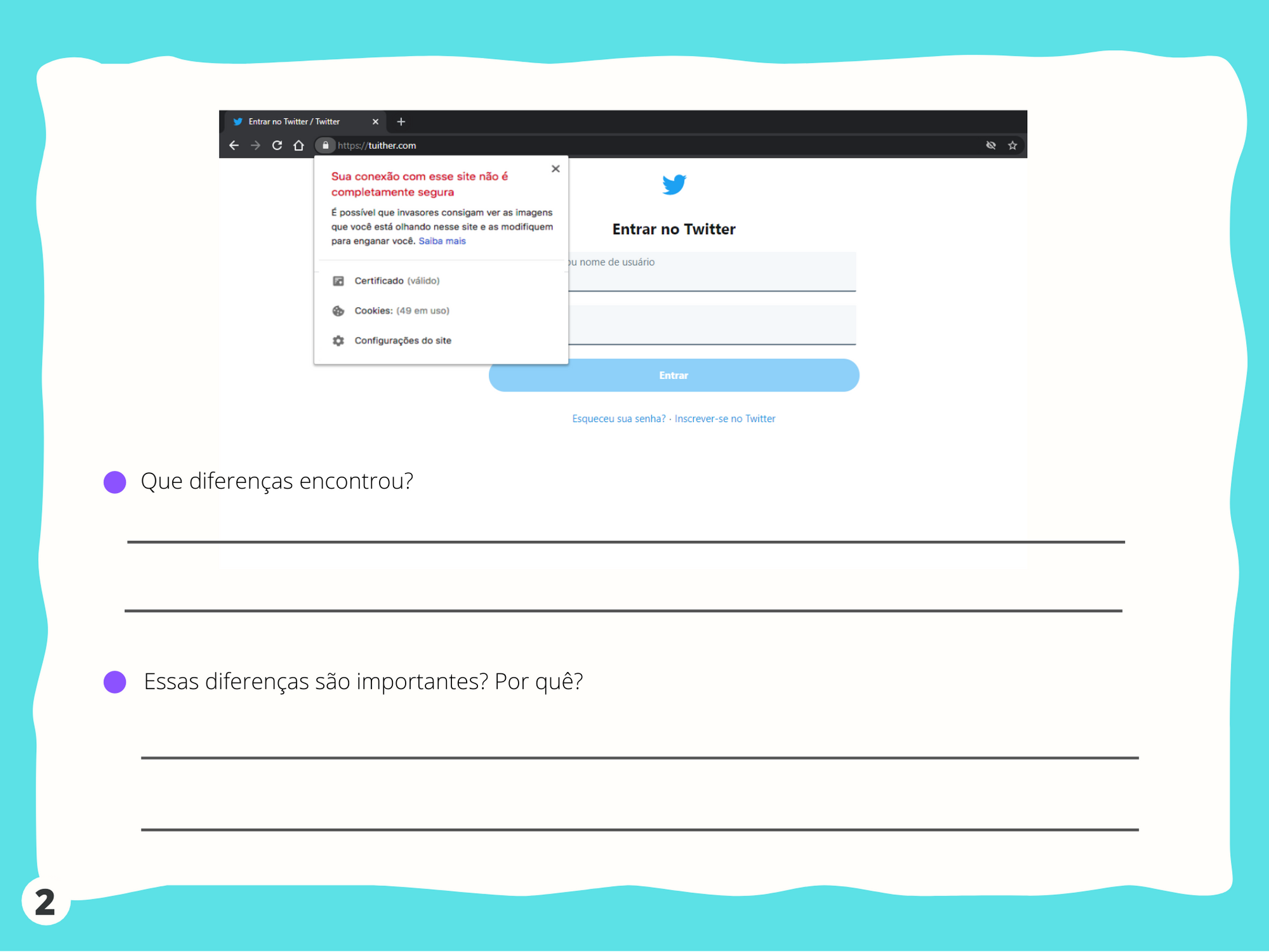 Refletimos com os alunos sobre a existência de impostores que, para confundir os usuários desavisados, usam sites com nomes tão próximos quanto possível aos de sites genuínos. Revisamos que, sempre que possível, é necessário: (i) verificar para onde aponta o link, botão, mensagem que está para ser clicada; (ii) se o site solicitar dados sigilosos, como senhas, e fizer sentido fazê-lo, caso em que tais informações só serão inseridas se a conexão for segura; (iii) se o site solicitar o download e / ou execução de um arquivo, ação que em geral deve ser evitada, a menos que seja um site de confiança suficiente e a situação o justifique; e (iv) se o que o site está dizendo, oferecendo ou propondo é genuíno.
