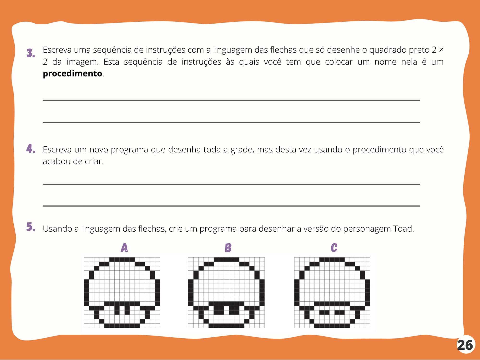 Depois de terminar a atividade dos quadrados, propomos aos alunos que resolvam a questão 5 do material. Eles terão que criar um programa que desenhe o personagem Toad (A). O objetivo inicial é que eles resolvam a atividade sem o uso de procedimentos, para depois destacar a importância de usá-los para modularizar programas.