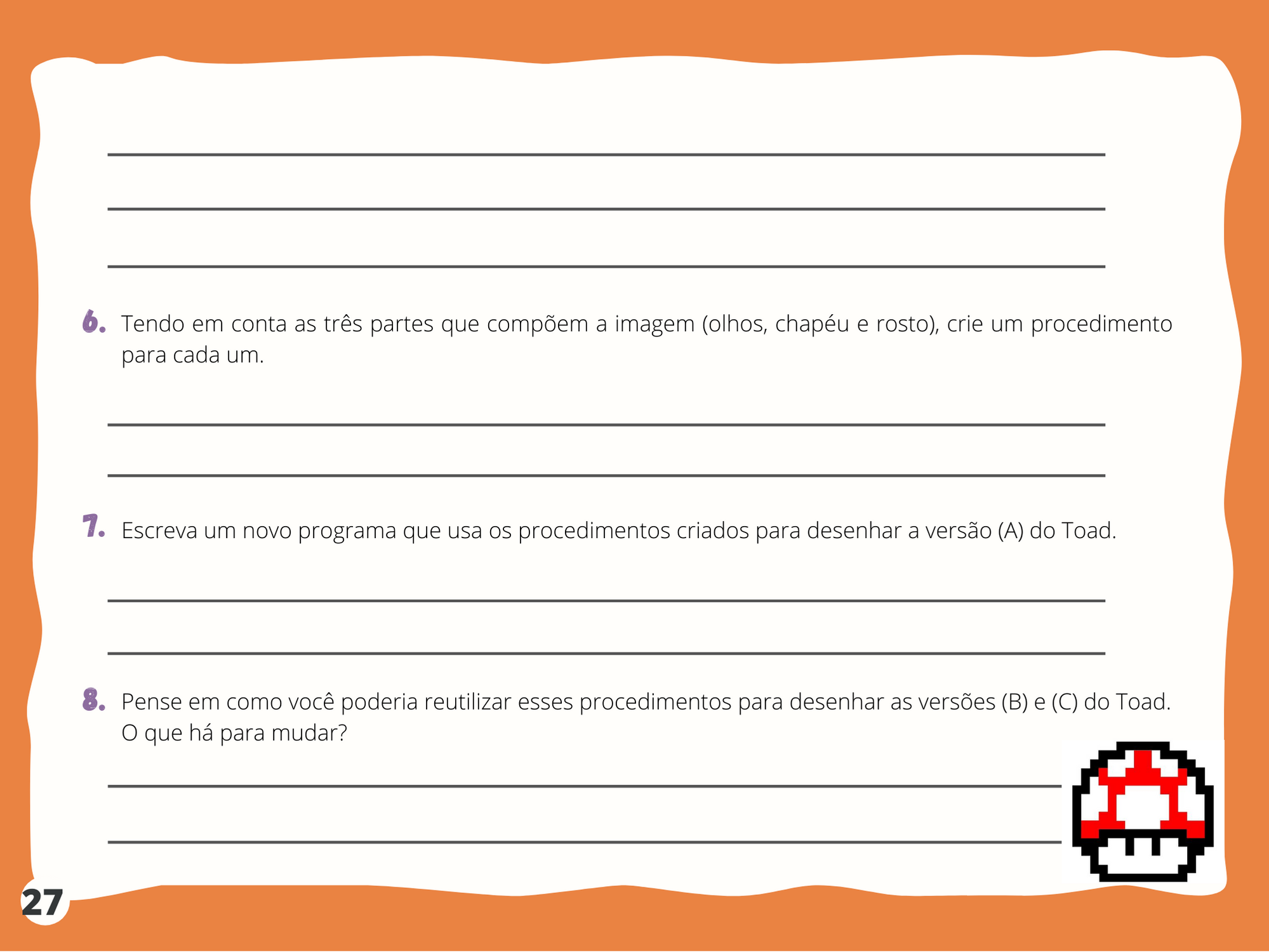 Conforme observado antes, se você comparar o Toad na figura (A) com aqueles nas figuras (B) e (C), você pode ver que eles diferem apenas no formato dos olhos. Portanto, os procedimentos “Posicionar chapéu”, “Desenhar chapéu”, “Posicionar rosto” e “Desenhar rosto” já criados podem ser reaproveitados para as demais variantes do desenho, que é o que é solicitado aos alunos na questão 8 do material.