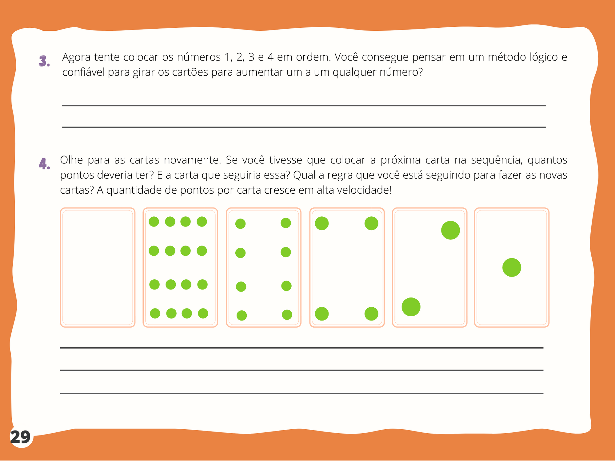 Com nossa ajuda, os alunos devem descobrir alguns padrões. Por exemplo, cada carta vira metade das vezes que a carta à sua direita. Além disso, eles podem perceber que uma em cada duas vezes precisam usar o cartão de ponto único. Aqui podemos relacionar o conceito matemático de paridade: cada vez que a carta com um ponto estiver voltada para cima, estaremos representando um número ímpar e cada vez que estiver voltada para baixo, um número par.