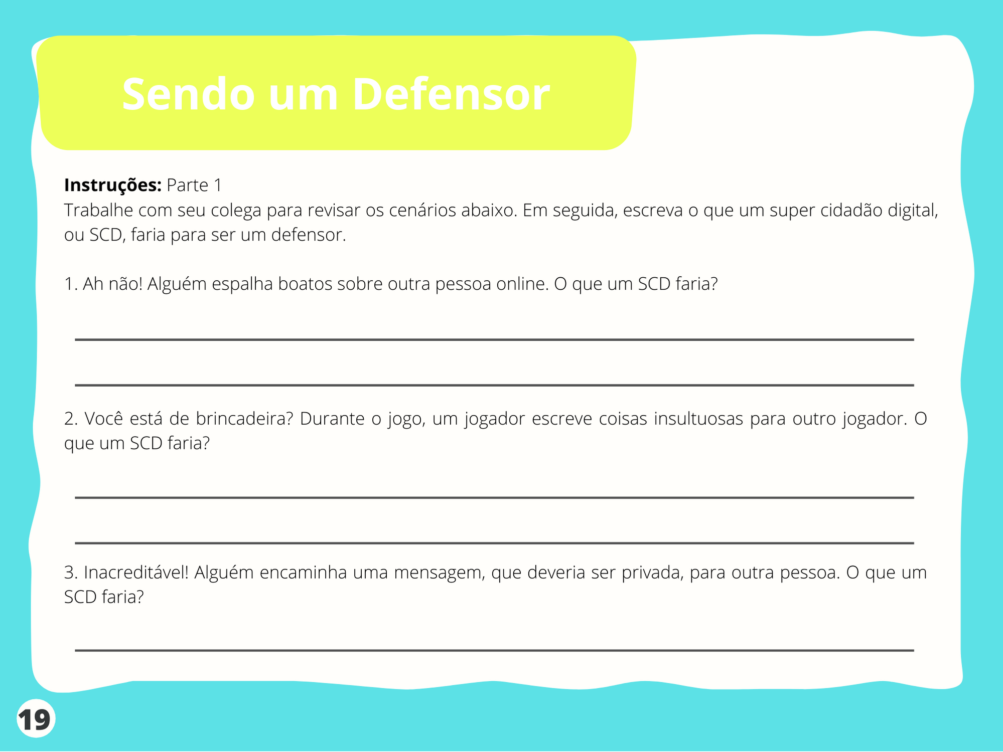 As ferramentas online fortalecem as crianças e também trazem grandes responsabilidades. Mas as crianças sempre sabem o que fazer quando se deparam com o cyberbullying? Neste capítulo você mostrou a seus alunos maneiras adequadas de agir e resolver conflitos, desde serem defensores até ajudar os necessitados.